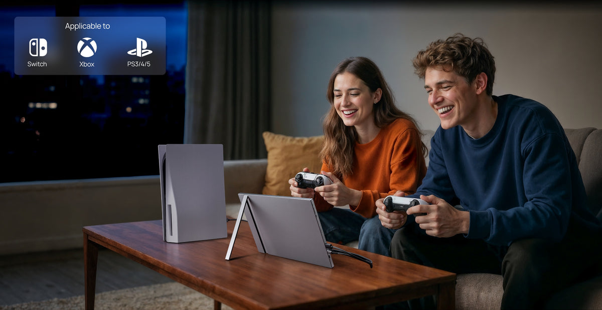 This portable 1080p monitor supports PS5, Xbox, Switch, laptops, smartphones, and tablets. From gaming console to laptop to smartphone - one portable laptop screen extender for every moment. This portable 1080p monitor supports PS5, Xbox, Switch, laptops, smartphones, and tablets. From gaming console to laptop to smartphone - one portable laptop screen extender for every moment.