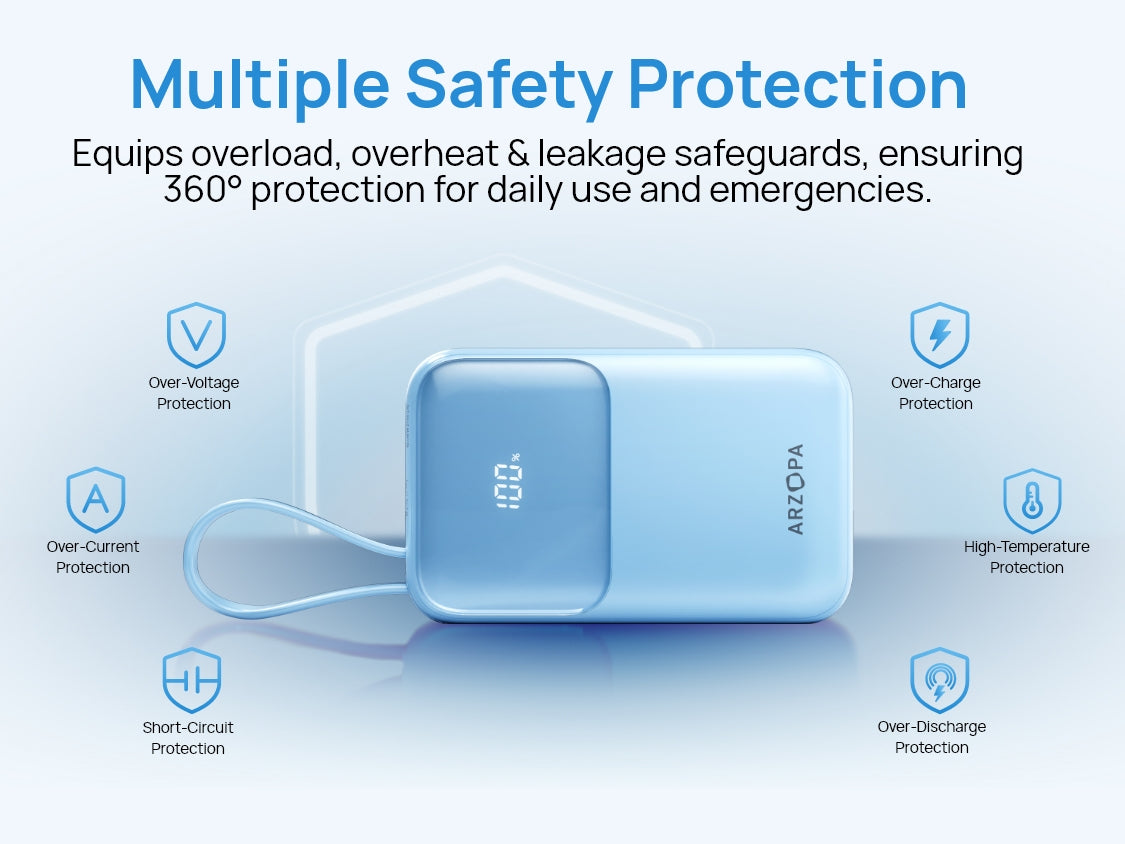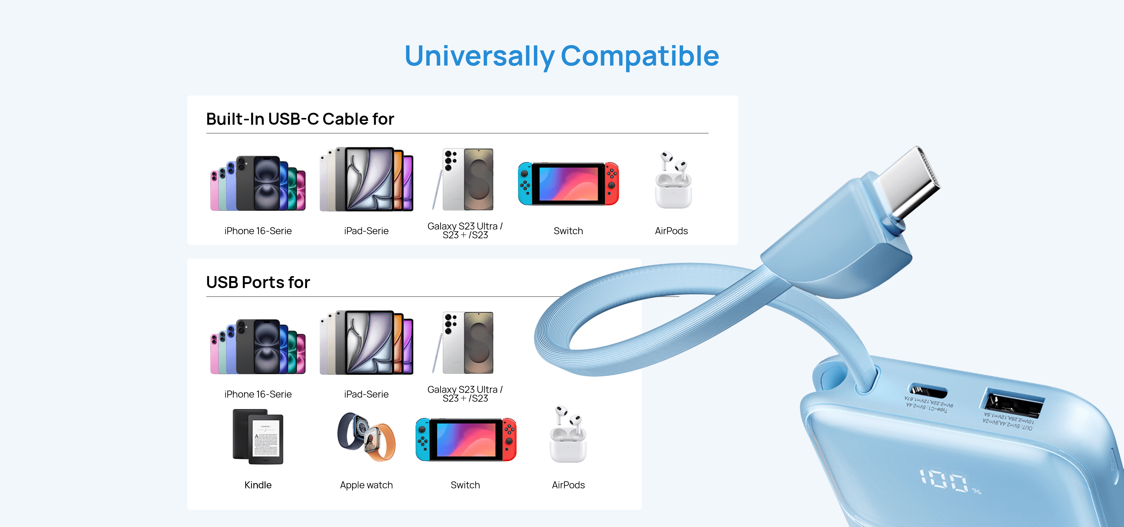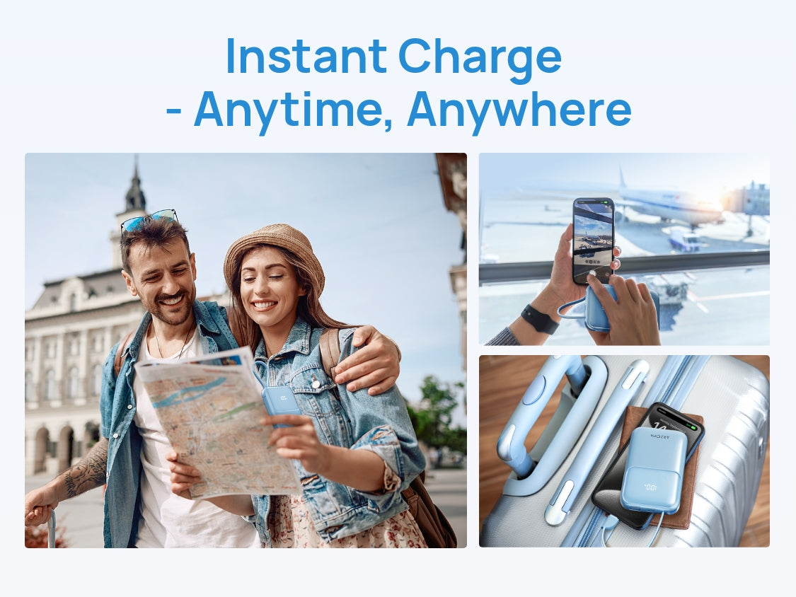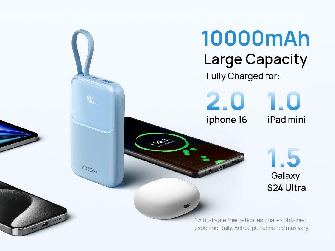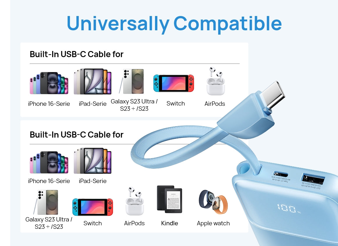- Built-in Type-C cable + one-tap battery status check (1%-100% real-time).