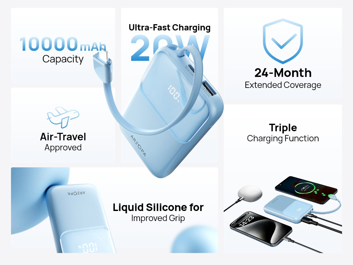 ARZOPA Portable Power Bank 10000mAh, 22.5W Fast Charging, Built-in USB-C