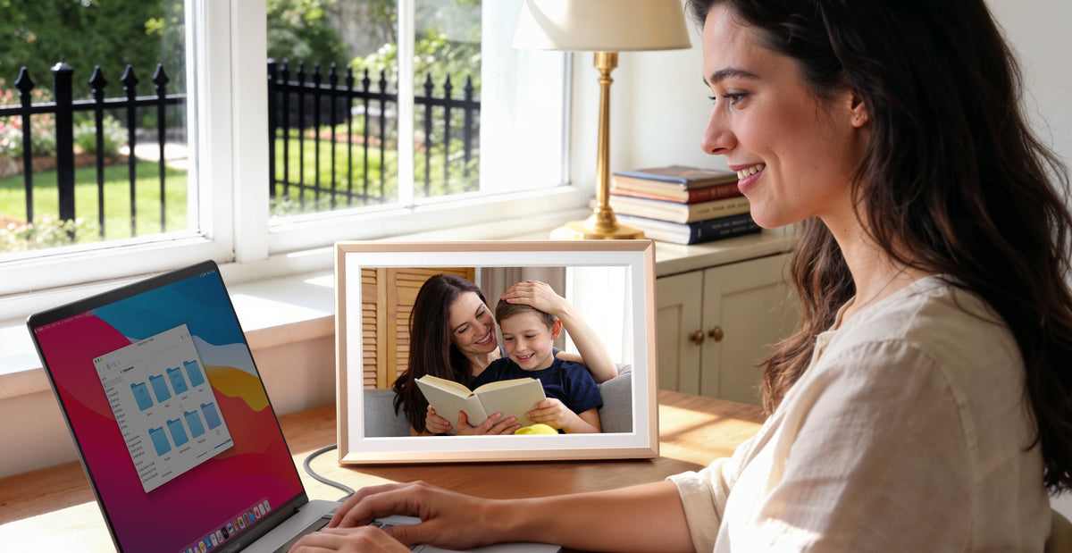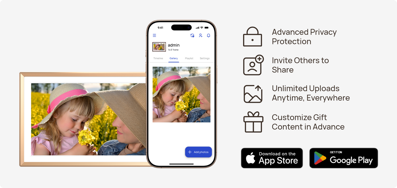 High-speed wireless transfer ensures your wifi photo frame receives memories in seconds. In addition, you can create unlimited playlists, upload photos/videos instantly with no quantity limits, and manage your digital photo album with smart filtering.